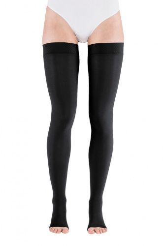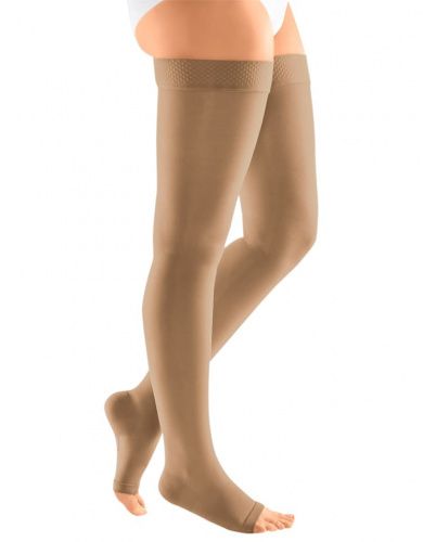 Компрессионные чулки 3-ого класса компрессии mediven plus на широкое бедро с открытым носком и силиконовой резинкой как универсальное решение в лечении заболеваний вен.