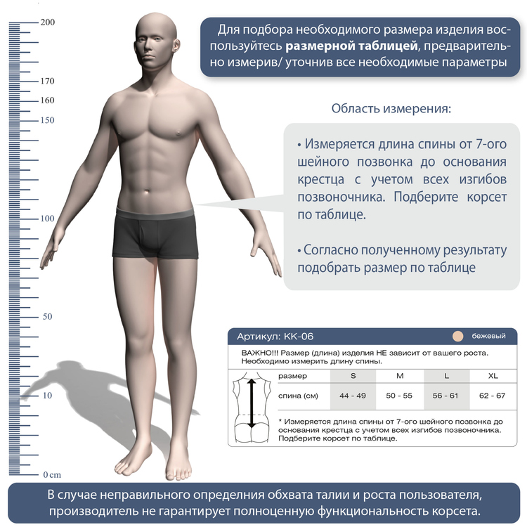 Измеряется длина спины от 7-ого шейного позвонка до основания крестца с учетом всех изгибов позвоночника. Подберите корсет по таблице.